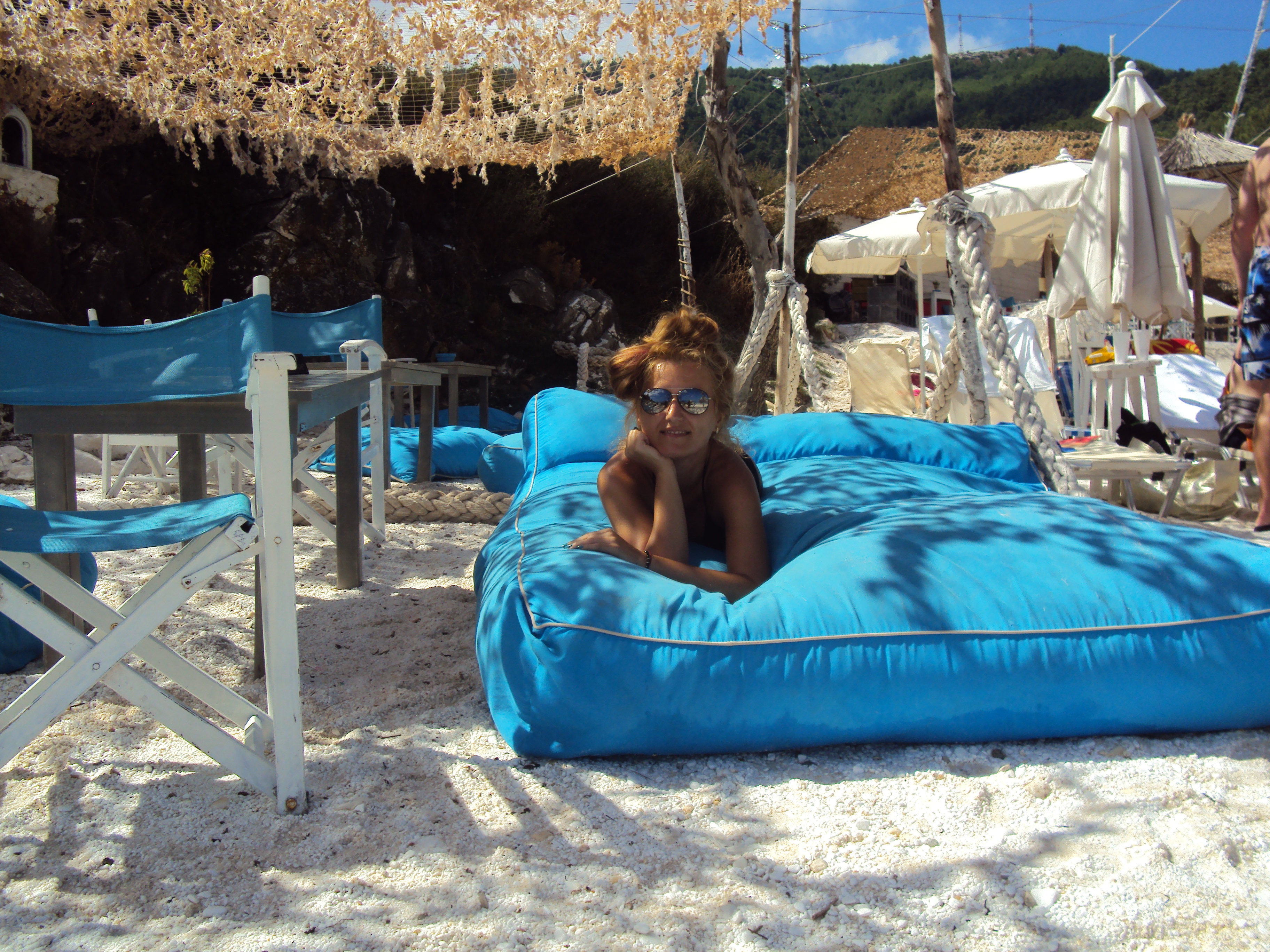 Salonikios Beach este genul de plaja care ma incanta, care te introduce in atmosfera de care ai nevoie pentru a te simti in vacanta: muzica in surdina, nisip fin, apa cristalina, paturi din paleti acoperite cu perne si acoperis din panza, hamacuri.
