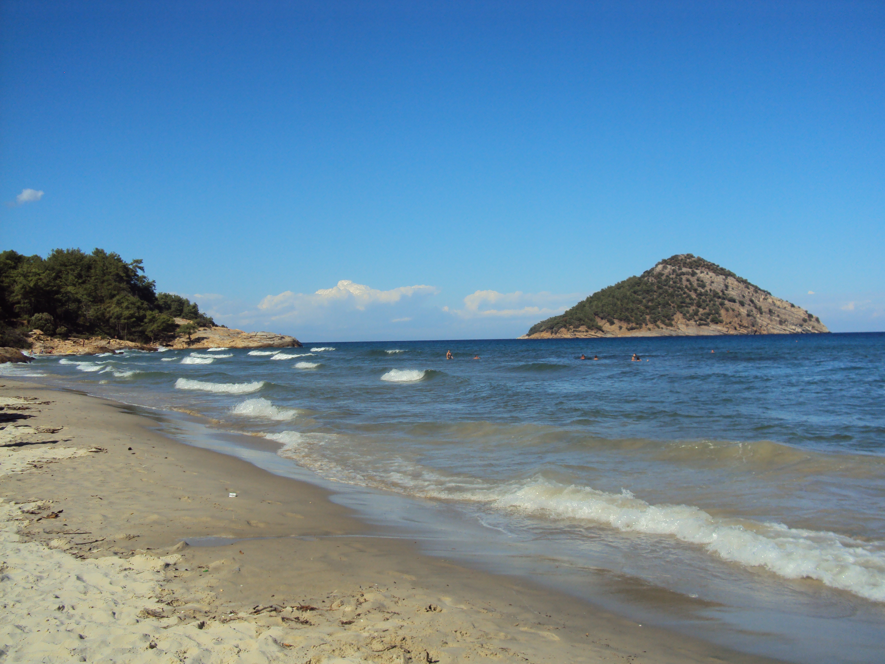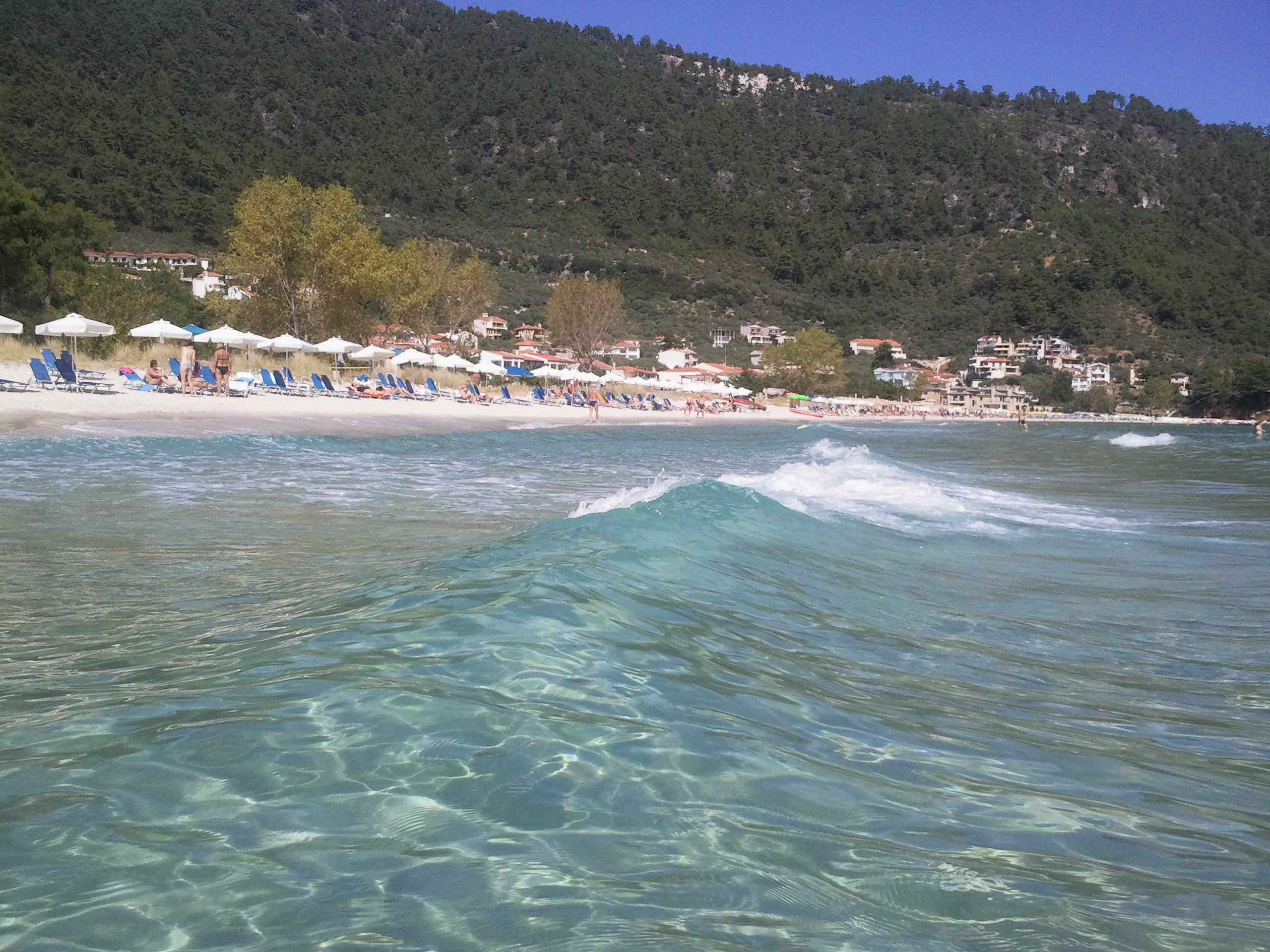 Este ce mai intinisa plaja din Thassos, cu nisip atat pe plaja cat si in apa, cu o mare albastra si lina, gen cum e la Mamaia, unde trebuie sa mergi foarte mult pana cand devine adanca.
