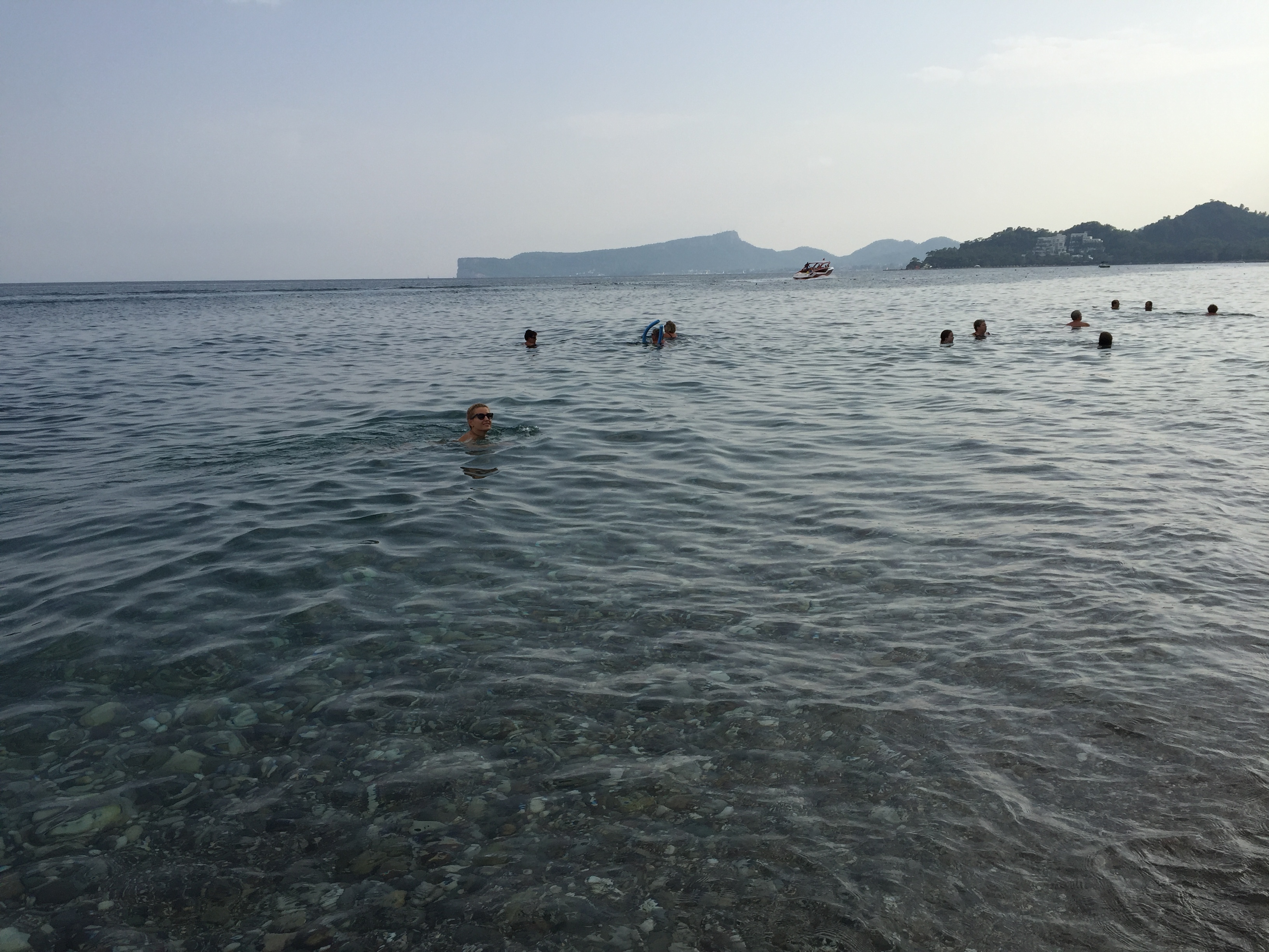 Cum am ajuns am plecat sa facem baie in mare, Marea Mediterana este destul de sarata in aceasta zona incat nu trebuie sa stii sa inoti, apa te tine la suprafata si te poti bucura de minunata priveliste oferita de muntii Taurus.
