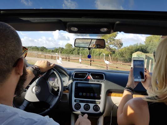 flamingo roz trecand agale prin fata masinilor la Zoo Safari Mallorca