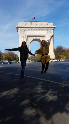 happy girls at Arch of Triumph