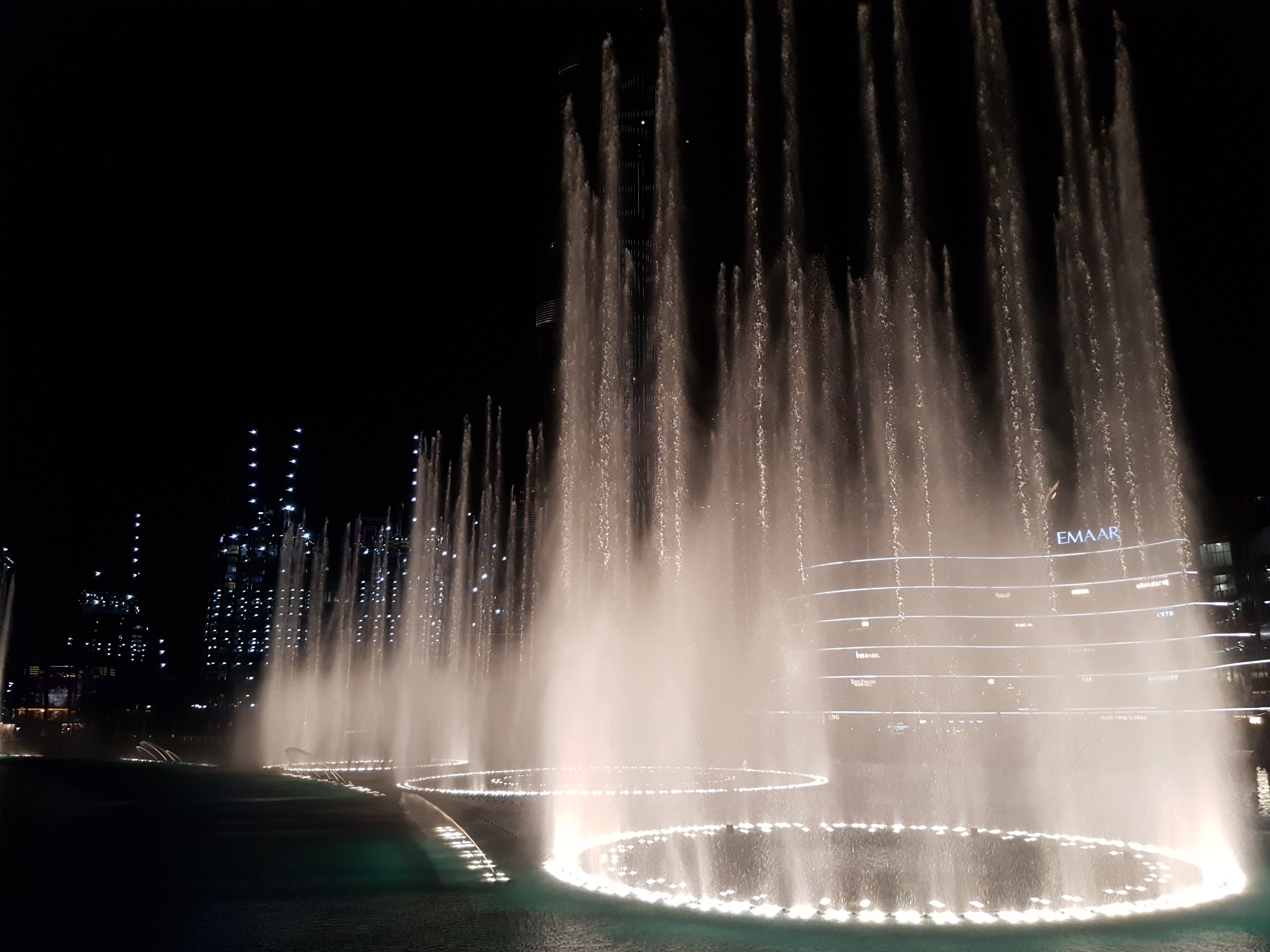 Au show-uri la fiecare jumătate de oră și sunt impresionante datorită clădirilor din jur. E recomandat să le vezi noaptea, atunci când pe Burj Kalifa au loc diferite proiecții.