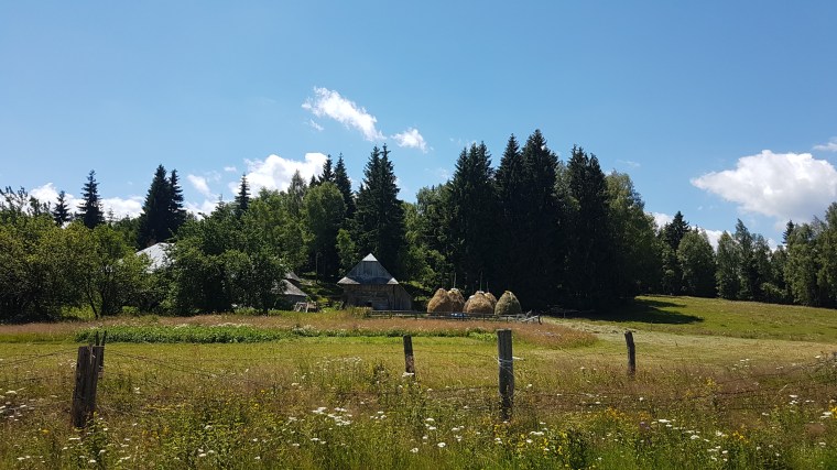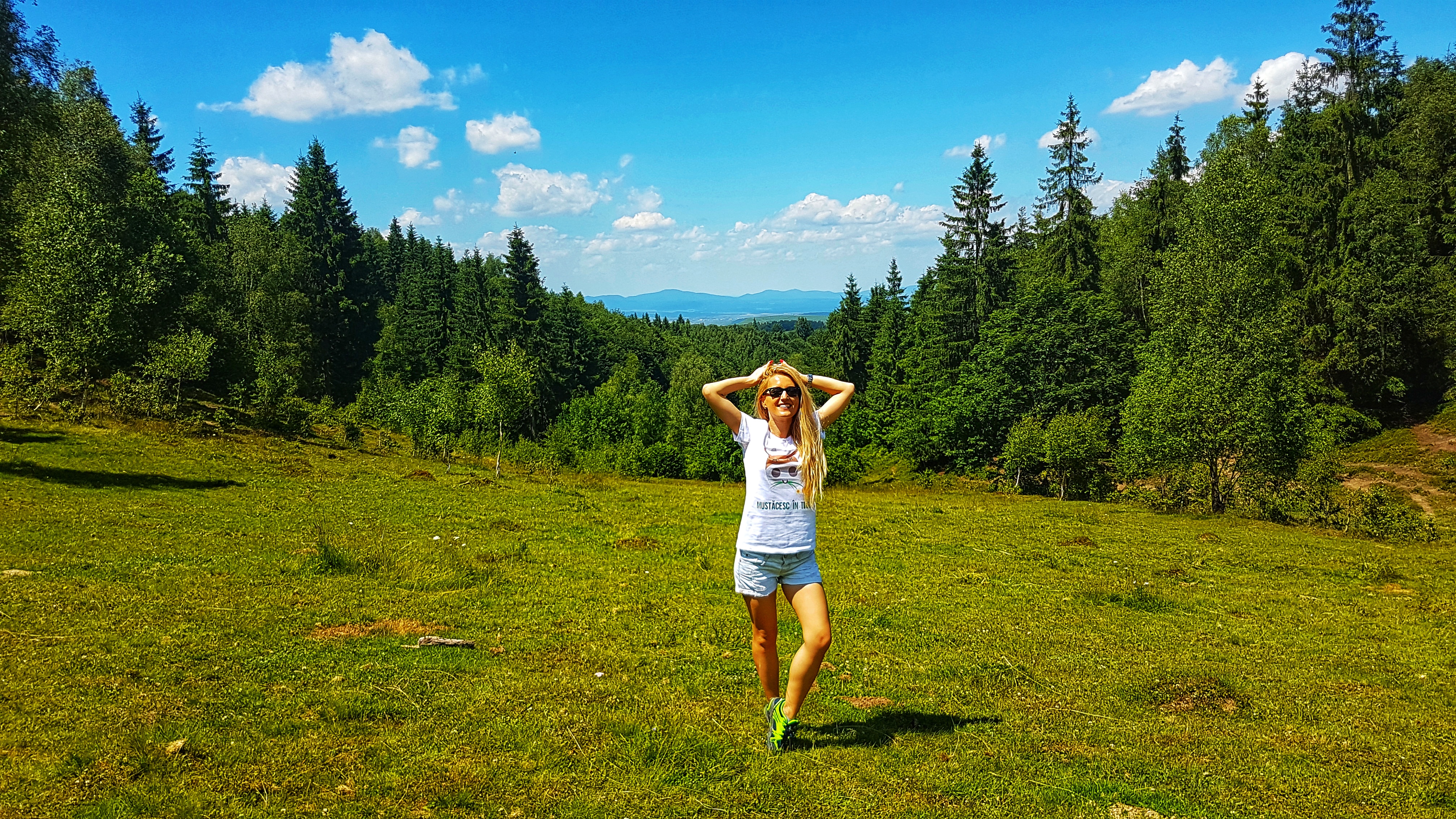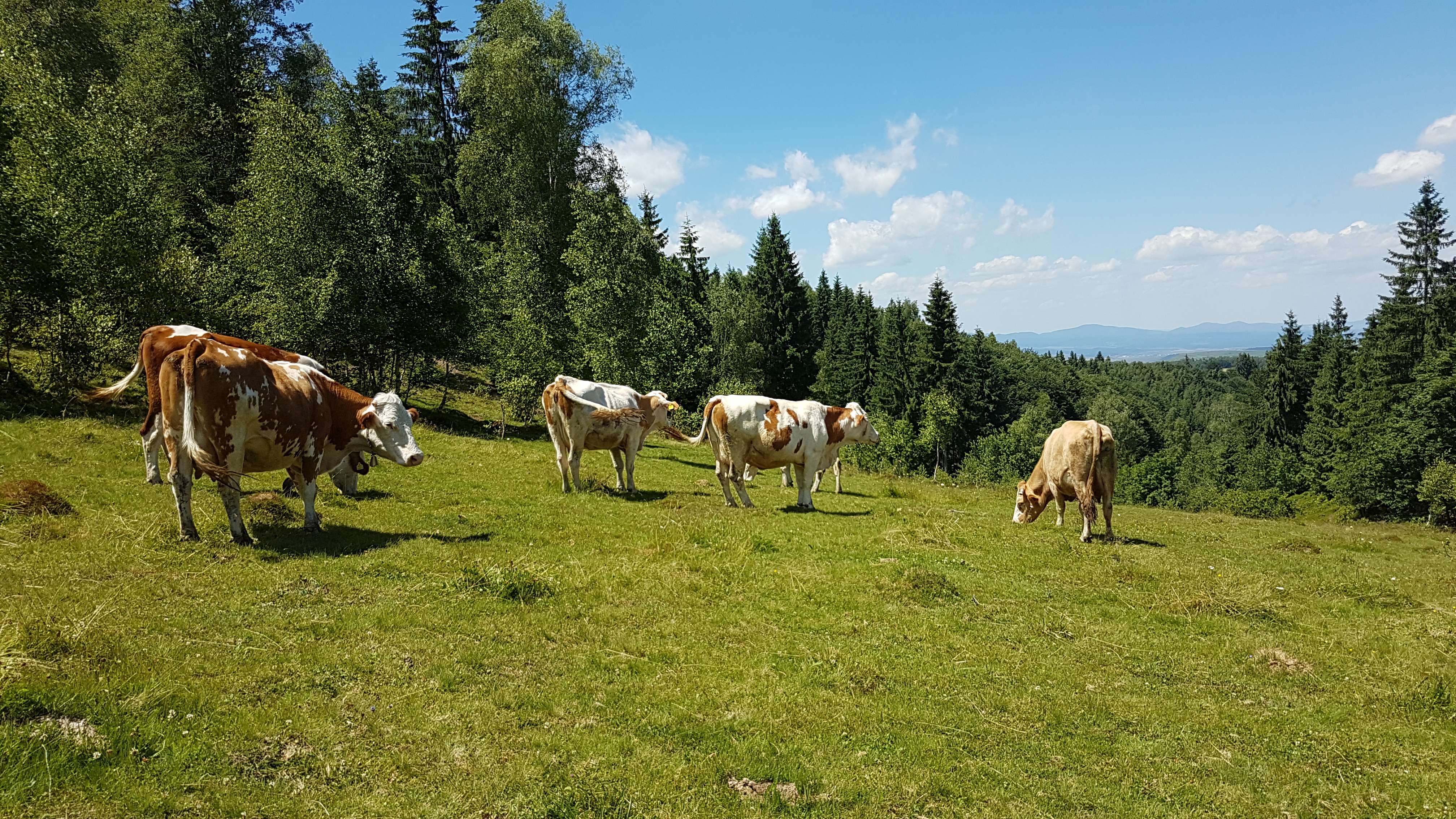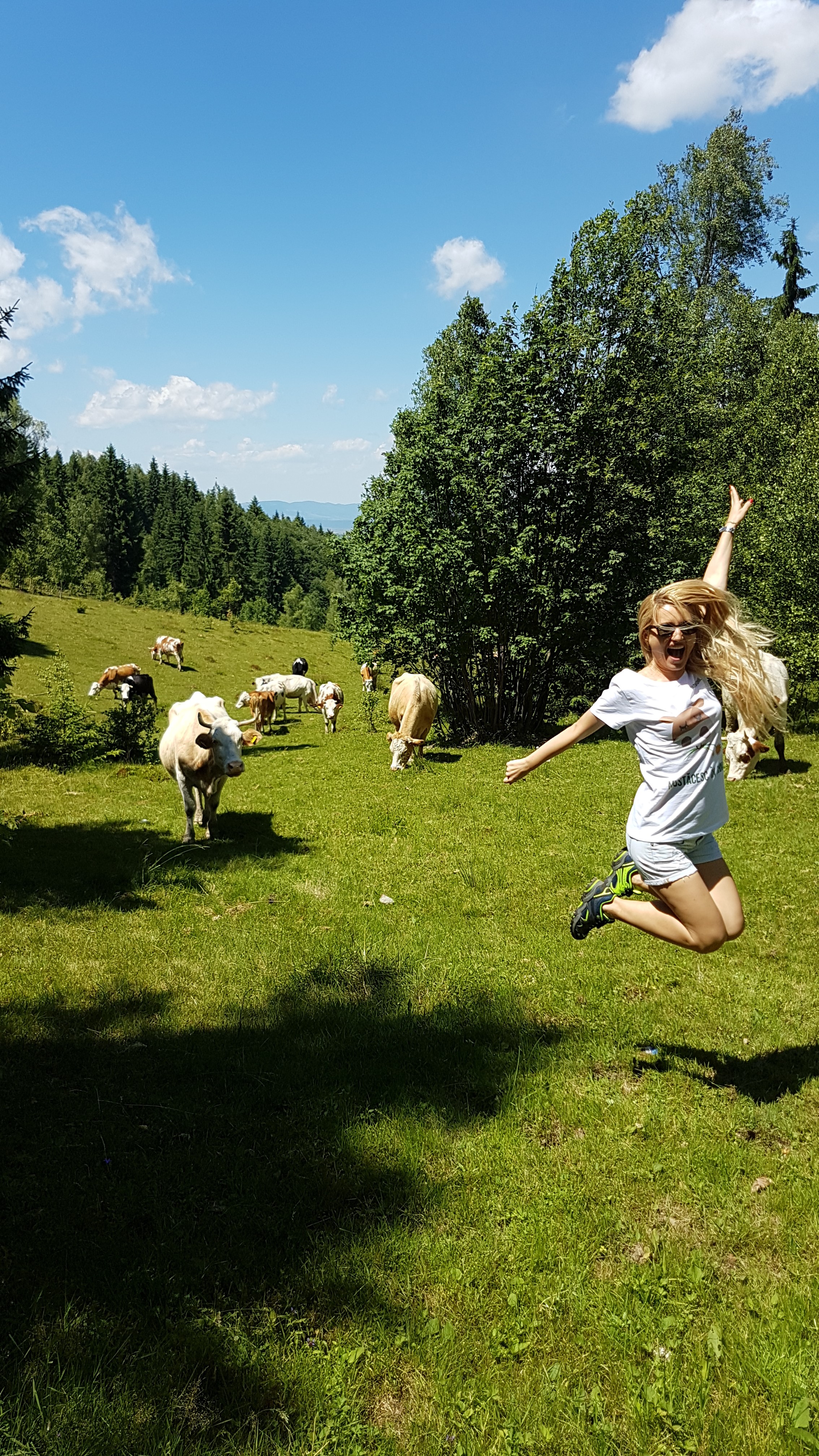 E atât de frumos încât nu aș mai fi plecat de acolo, totul de la cerul senin cu nori albi ca din spumă de lapte, brazii înalți, piscurile munțiilor Gilău, tufele de afine și iarba afânată care atunci când calci te afunzi în ea, te îndeamnă la tihnă. Văcuțele nu au niciun stres, rumegă și mustăcesc în tihnă în acest cadru de poveste, iar pentru o secundă parcă le invidiezi pentru că pentru ele se pare că timpul s-a oprit în loc.