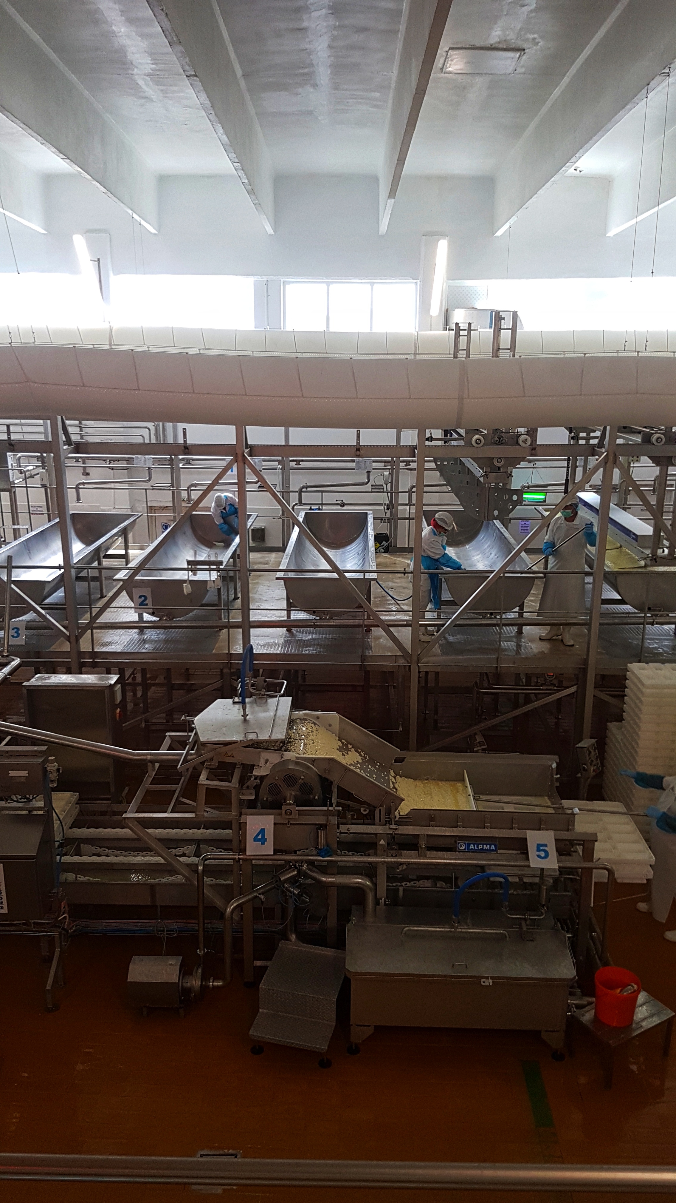 Doamna Susana Hurducaș, cel mai bun brânzar de la fabrica Napolact, ne-a arătat și ne-a explicat întreg procesul de producție. Sunt 10 vane care au o capacitate de 1500 de litri fiecare, unde se amestecă laptele, culturile lactice și cheagul. Apoi are loc separarea coagului de zer și se obține un capul de brânză de 2 kg care este maturat în sarmură.