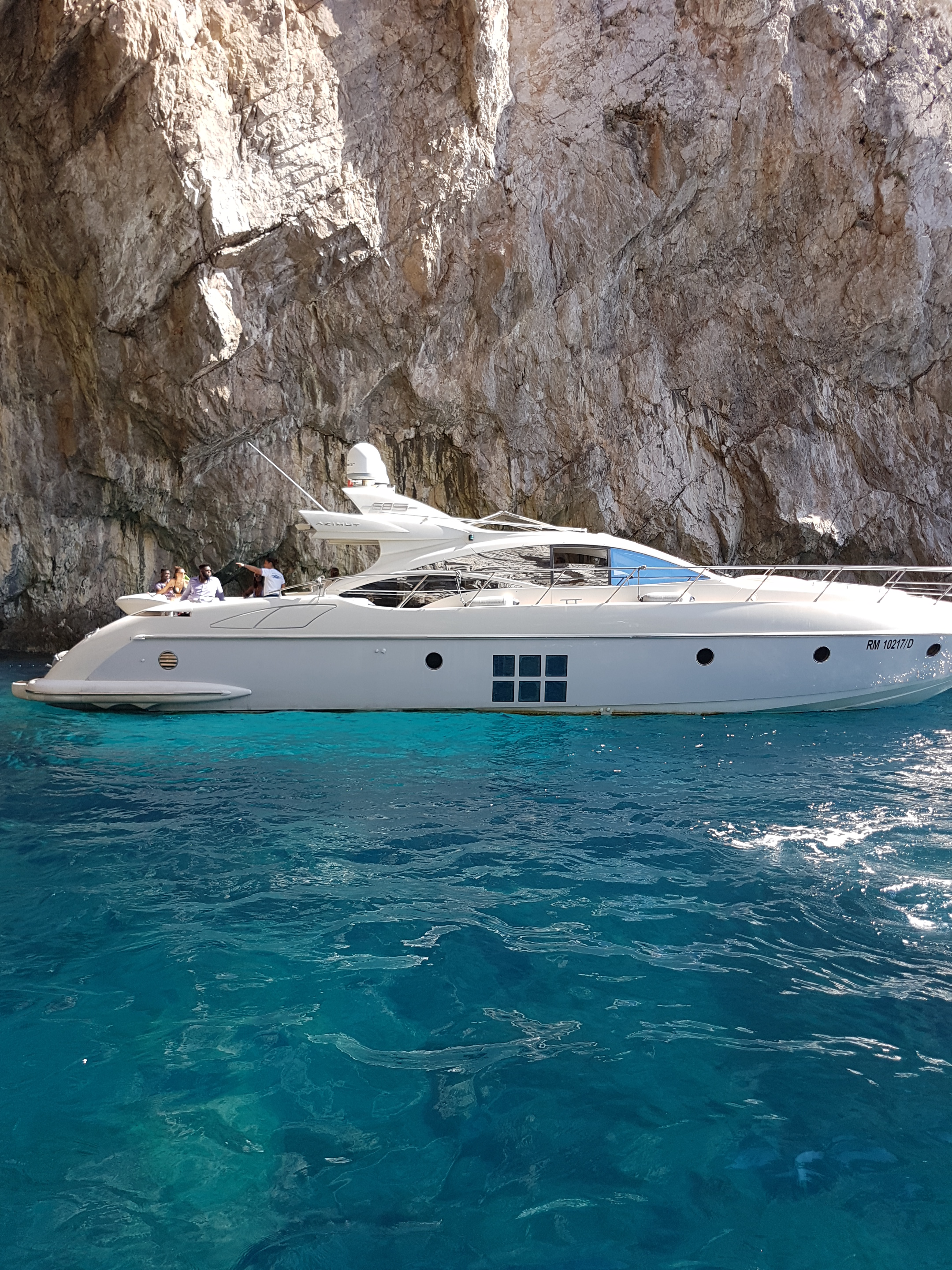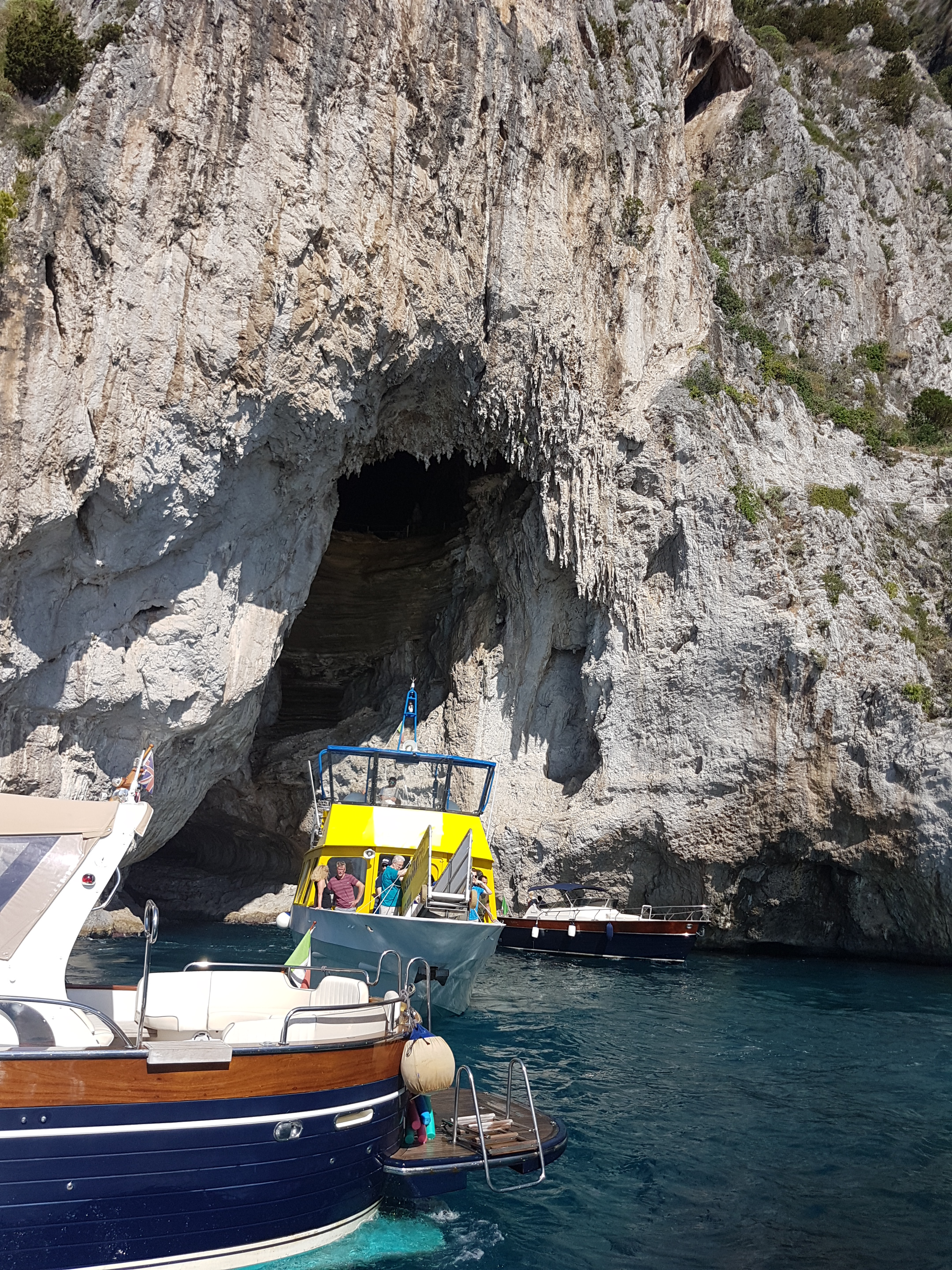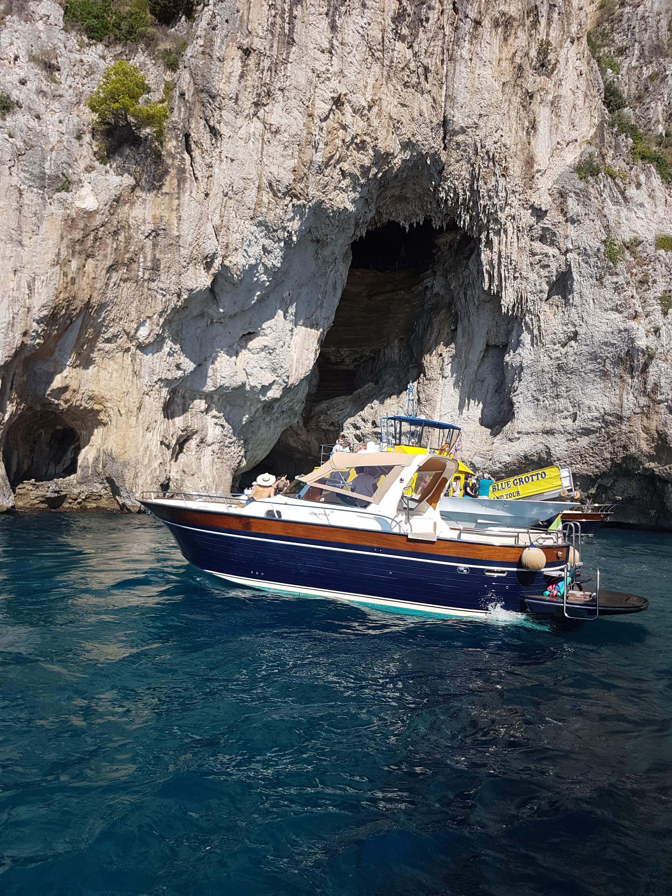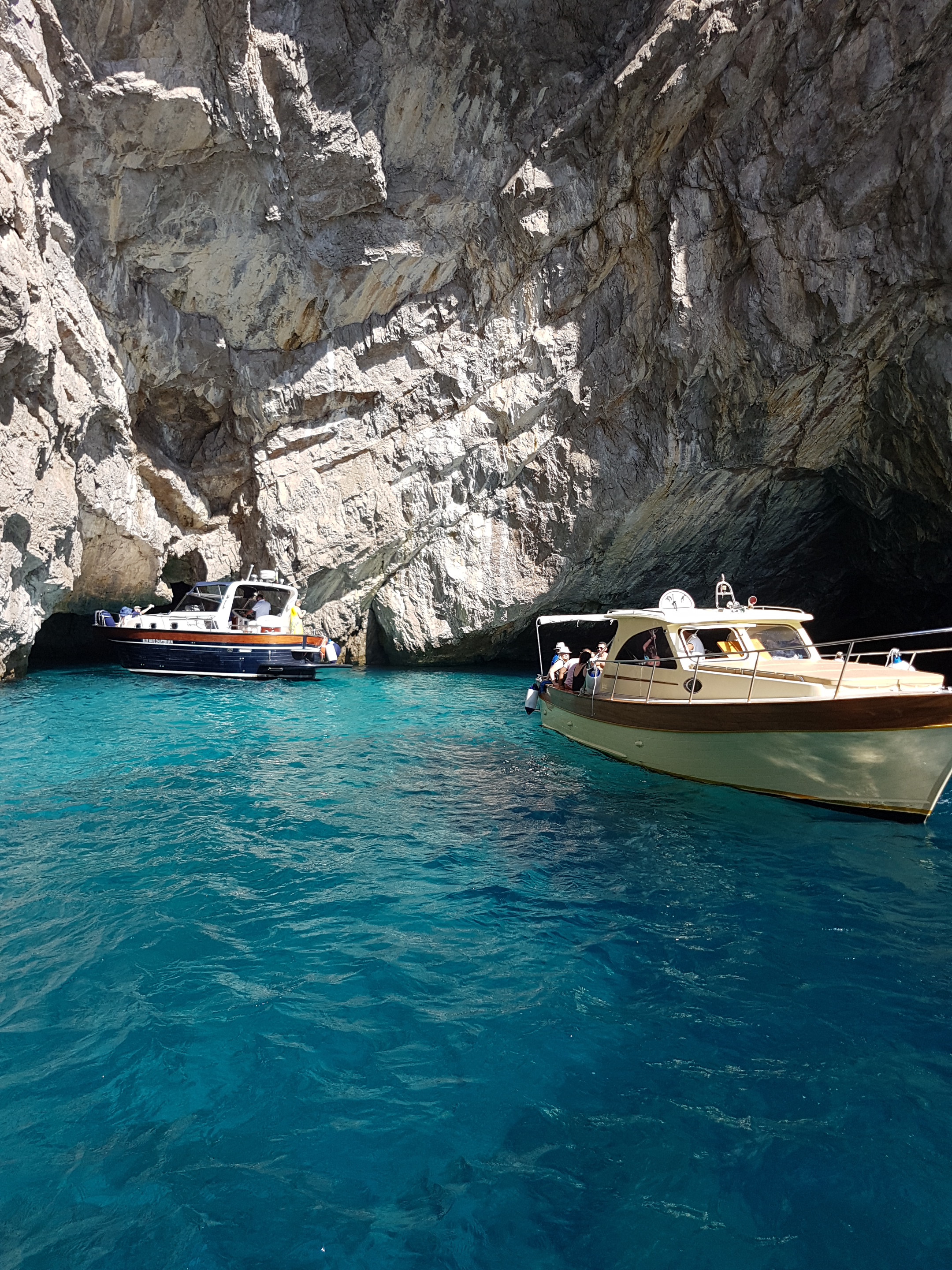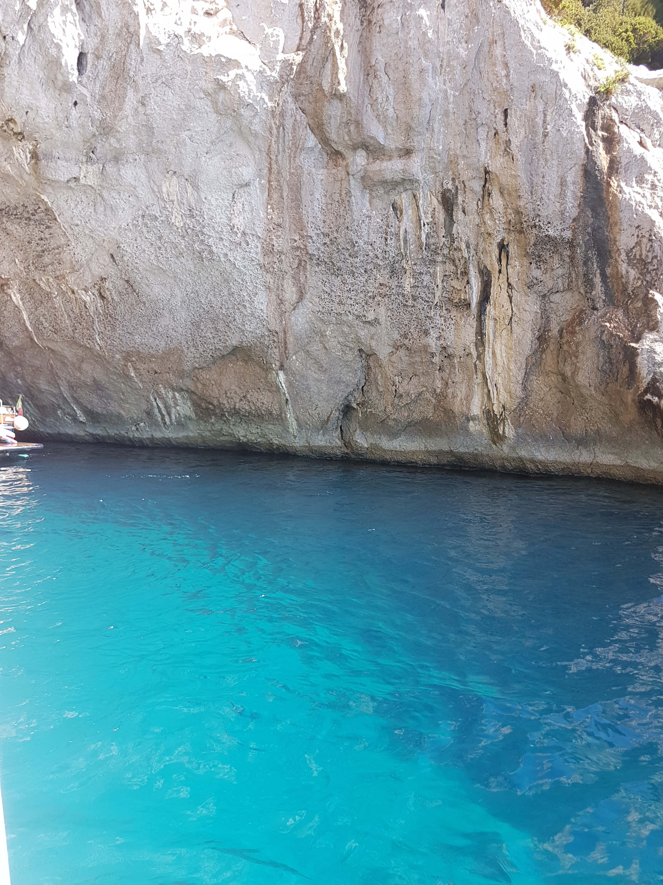 Grota Albastră în care se intră cu o barcă mică, doar cu trei persoane pentru că trebuie să te lași pe spate, stâncile la intrare fiind foarte joase.