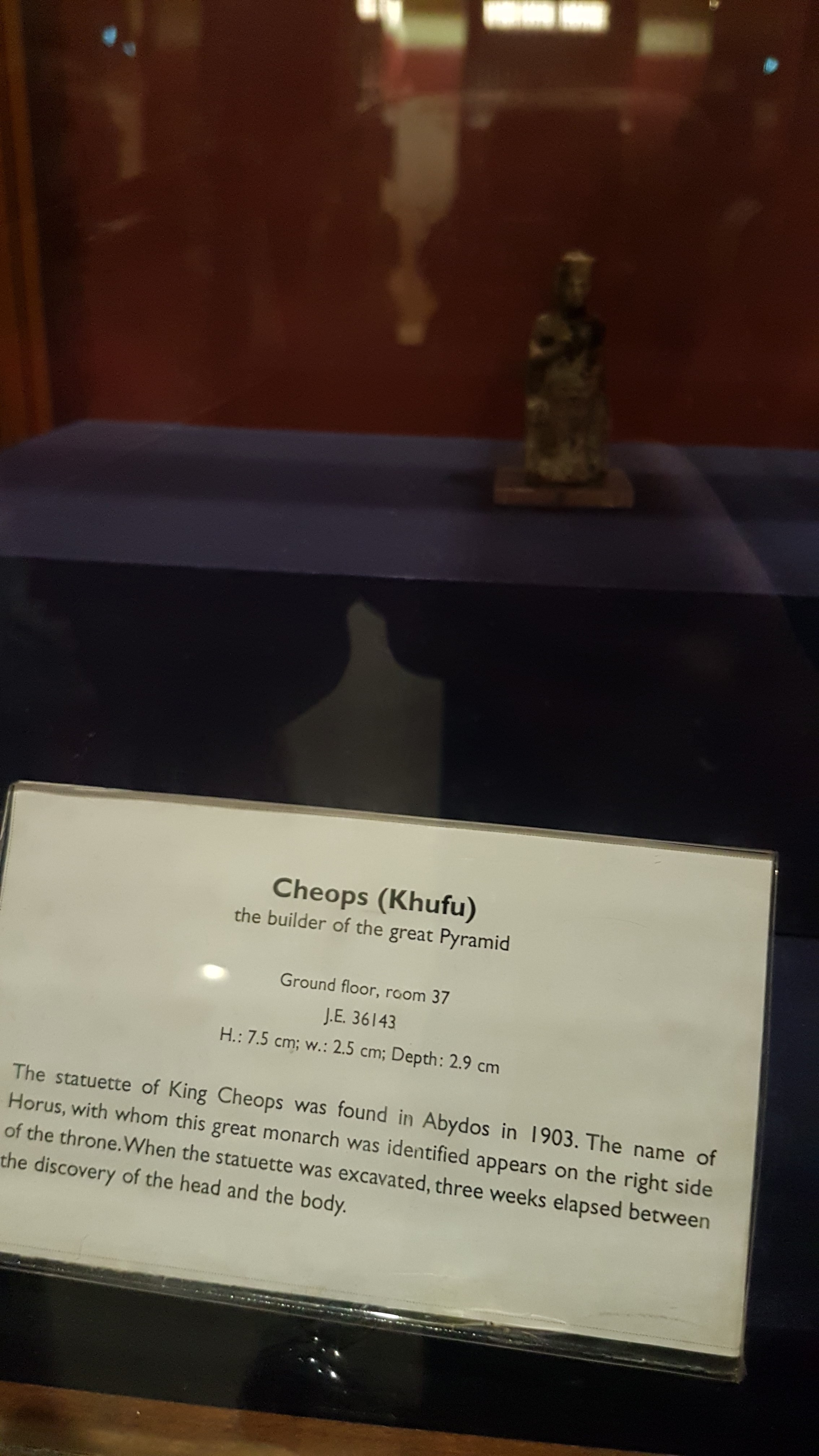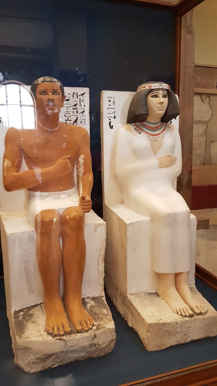 Alte statui care te impresionează sunt ale lui Rahotep, fratele lui Cheops, cu soția lui Nofret. Ochii realizați din pietre prețioase, pupila din bitum și corneea din cristal îți dau impresia că se uită la tine.