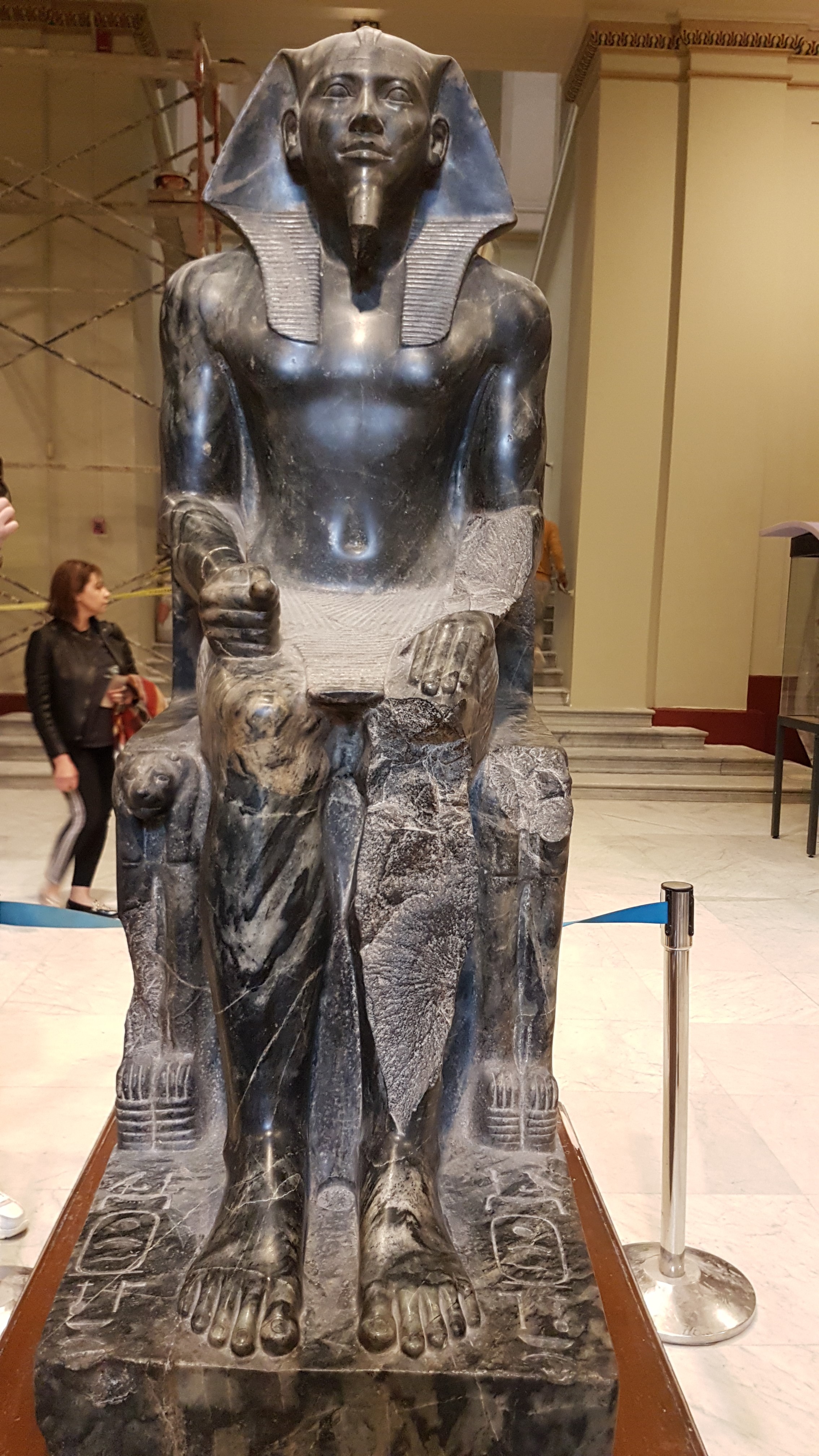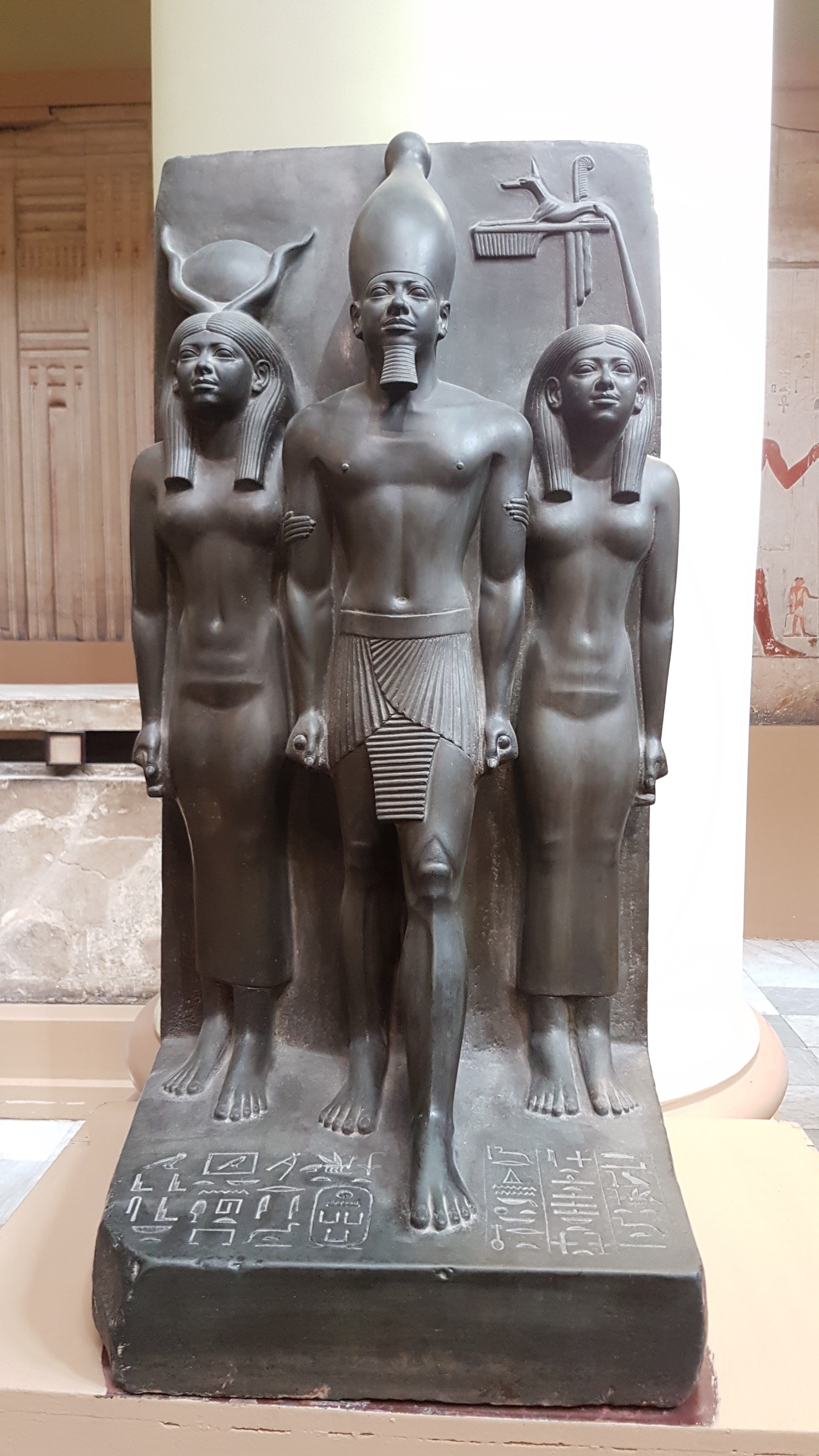 Triada de statuii realizate din granit negru, faronul Mykerinos – cel care a realizat cea mai mică piramidă dintre cele 3 de pe platoul de la Giza, flancat de două zeități: Hator și o zeitate locală. Hator este zeița dragostei, frumuseței, amuzamentului, maternității și apare reprezentată în 3 ipostaze: ca vacă, corp de femeie și cap de vacă, complet ca femeie cu două coarne și discul solar. Faraonul Mykerinos este reprezentat mai înalt, poartă coroana Egitpului de Sus și are numele sculptat în cartuș. Este într-un marș militar, cu piciorul stâng în față care pe lângă putere mai poate simboliza, ultimul pas în viața actuală și primul pas în viața de dincolo; faptul că partea stângă e mai grea din cauza inimii și că regele își urma inima.