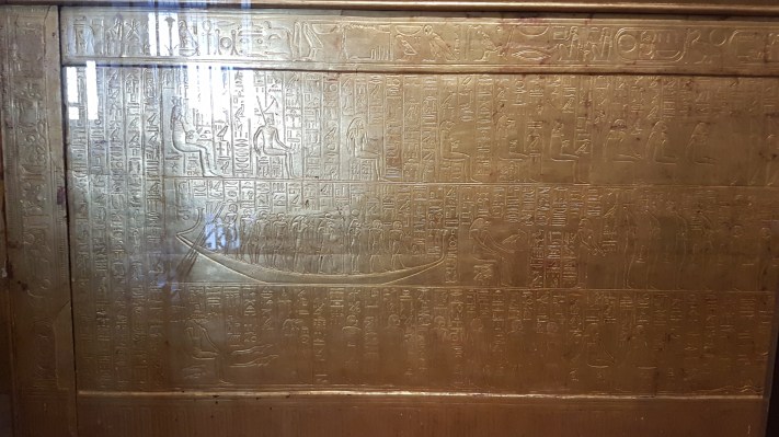 Detalii de pe unul dintre cele 4 sicrie din lemn aurit ale lui Tutankamon, barca pe care se află Zeița Hator, Zeul Anubis si Horus.