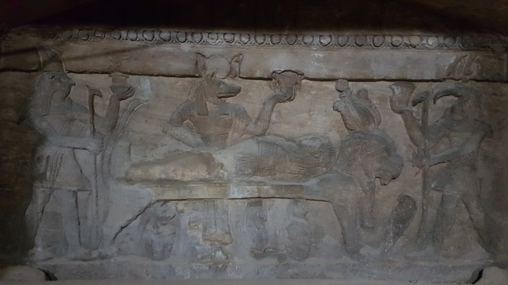 Zeul Anubis – zeul Morții, supravegheat de zeul Horus, realizează procesul de mumificare.