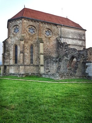 Exteriorul mânăstirii Câța – cu ferestre si rozete tipice goticului