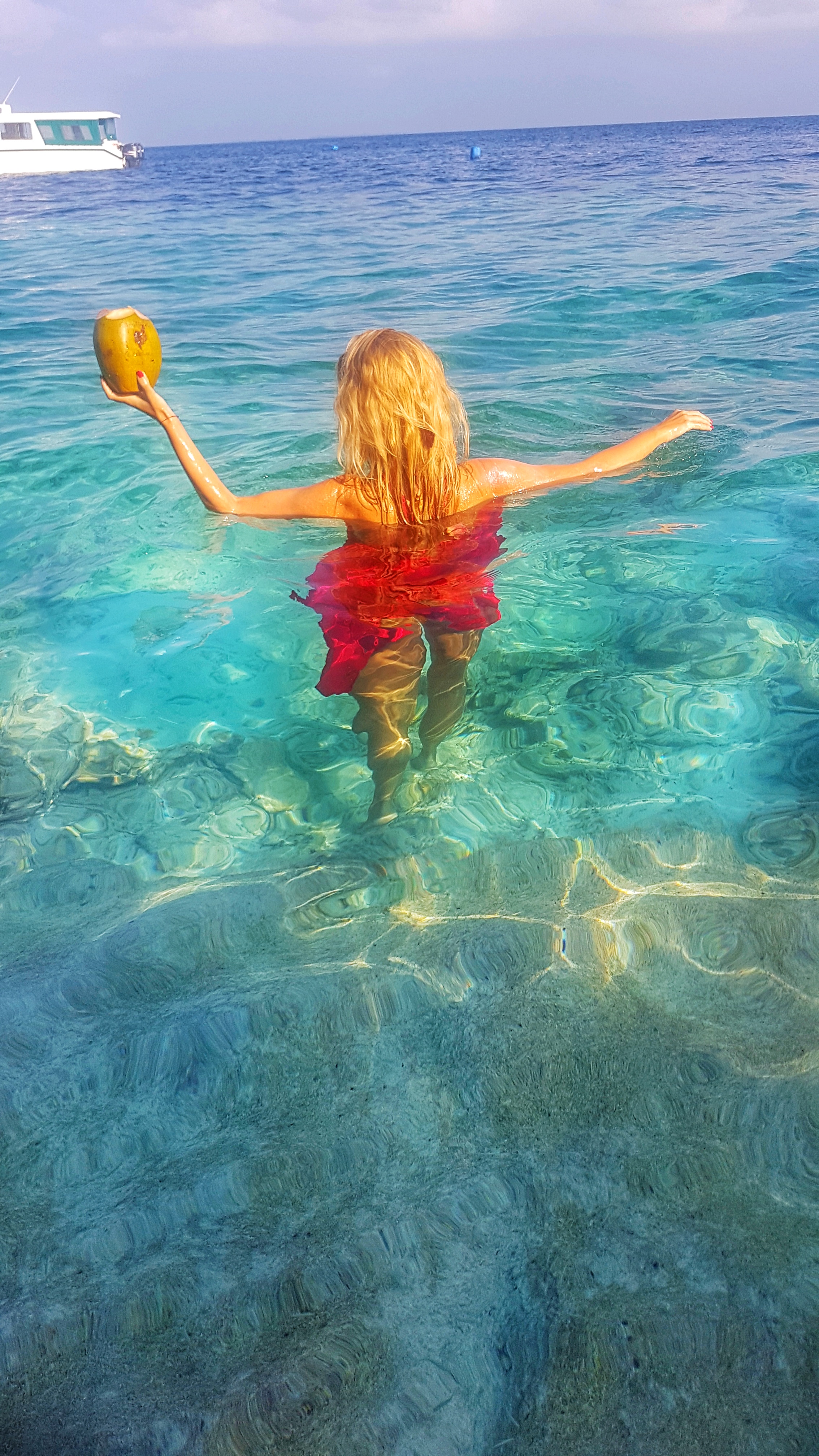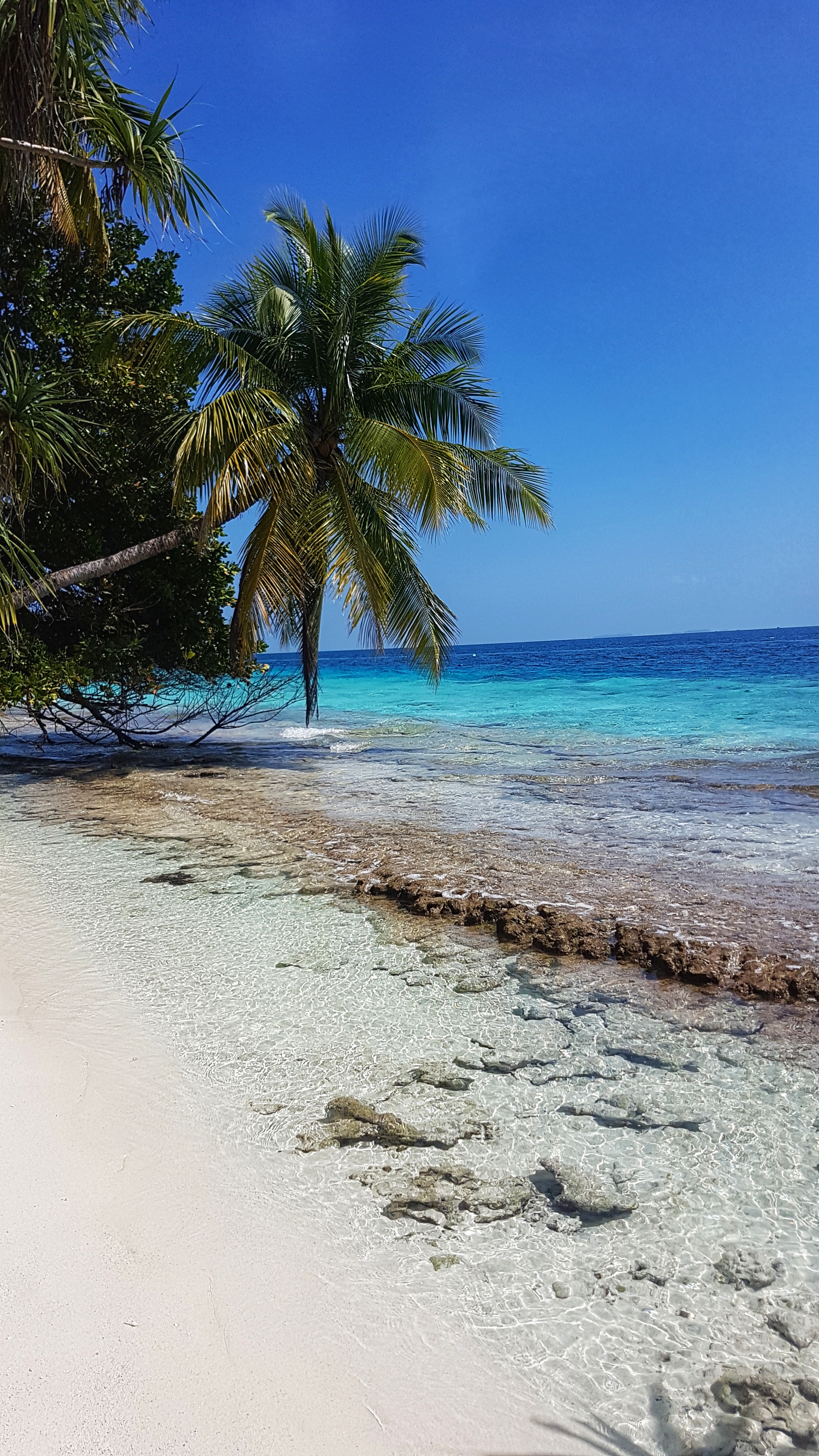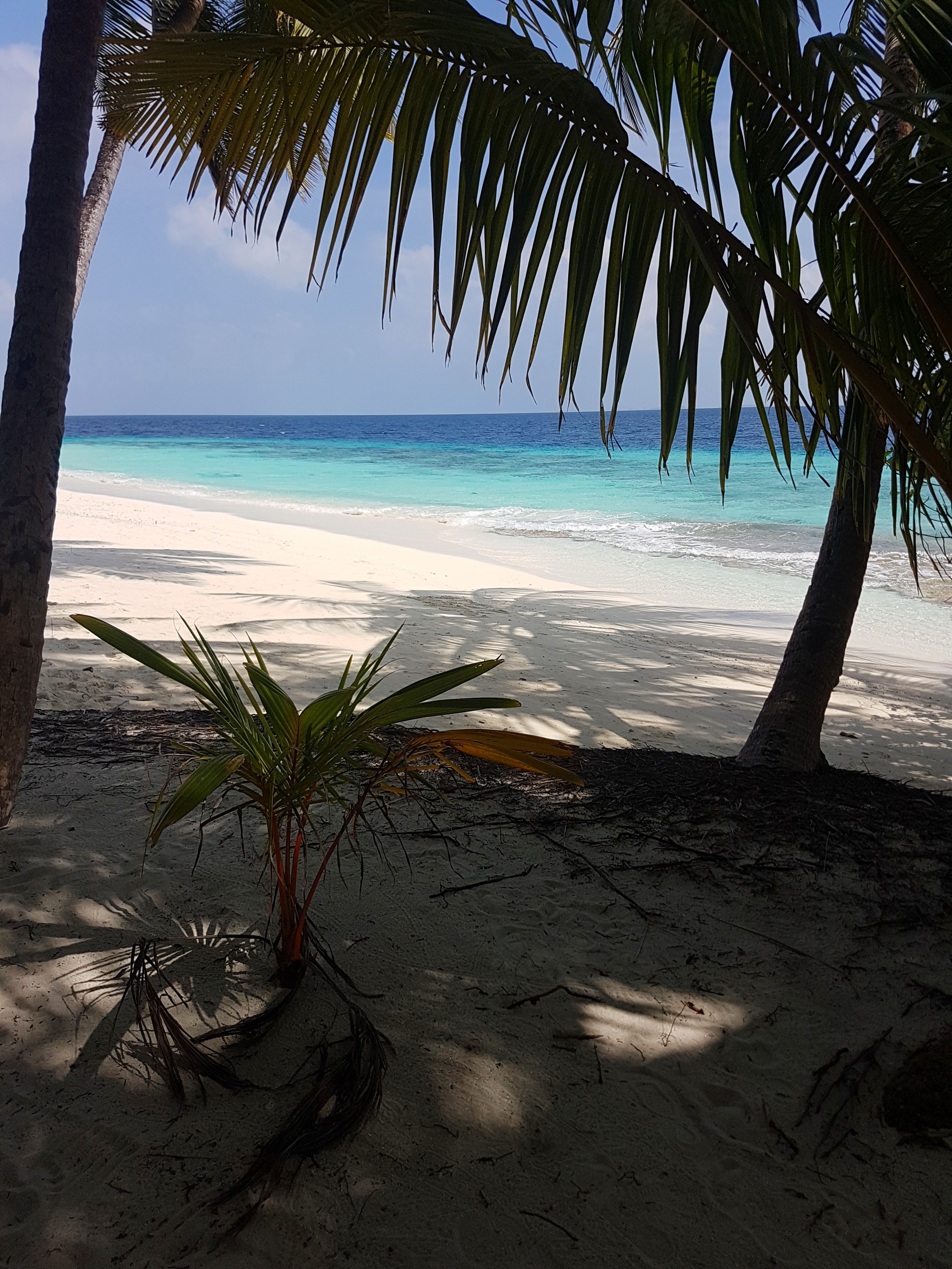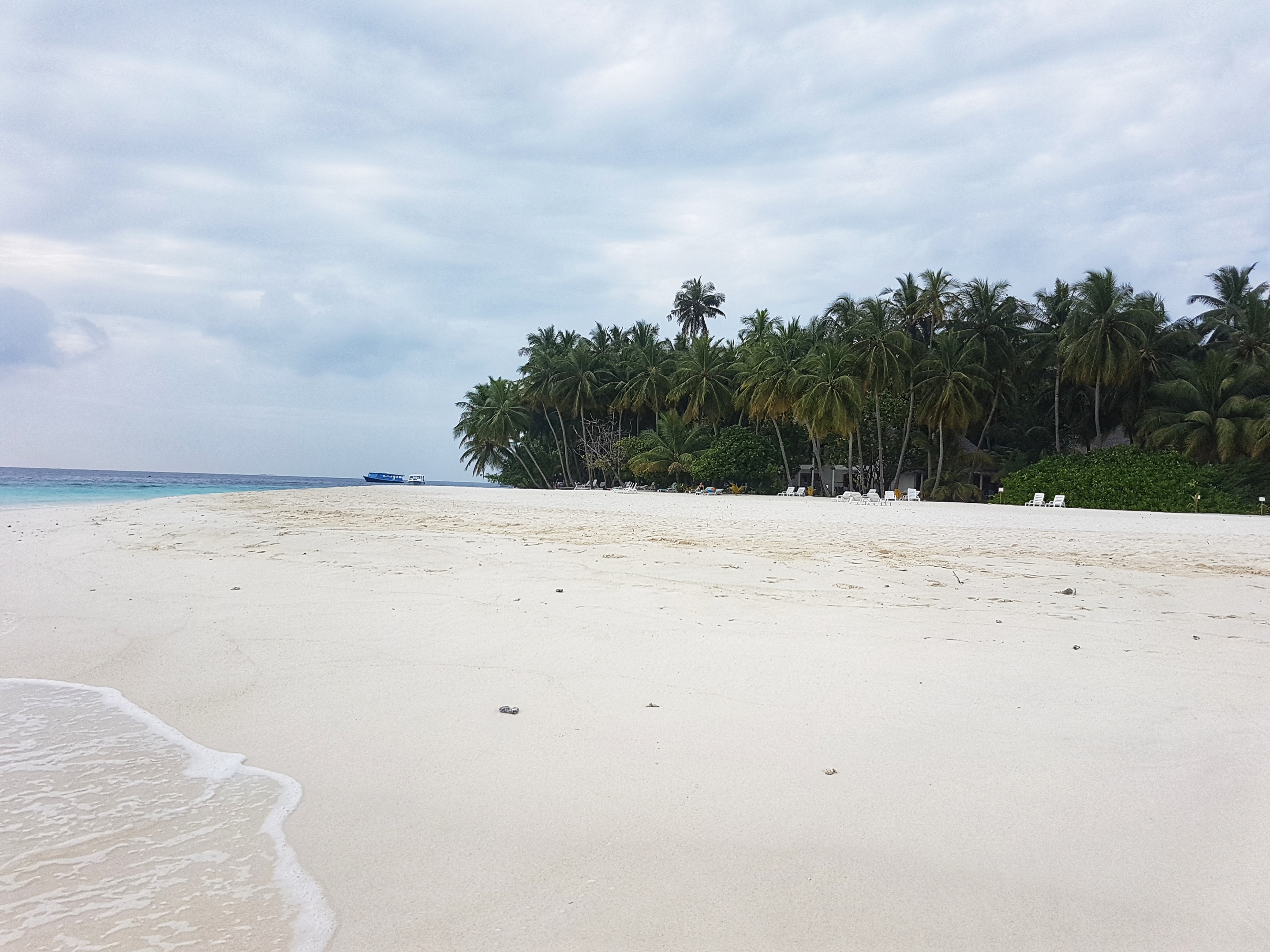 Eu am stat la Fihalhohi Island Resort și este insula visurilor mele, cu apă turcoază, plajă întinsă cu nisip alb și vegetație luxuriantă. Este exact cum am visat pentru că mi-am dorit foarte mult o insulă cu palmieri până în mare, astfel încât în timpul prânzului să pot înota la umbră, fiind o mare iubitoare de apă.