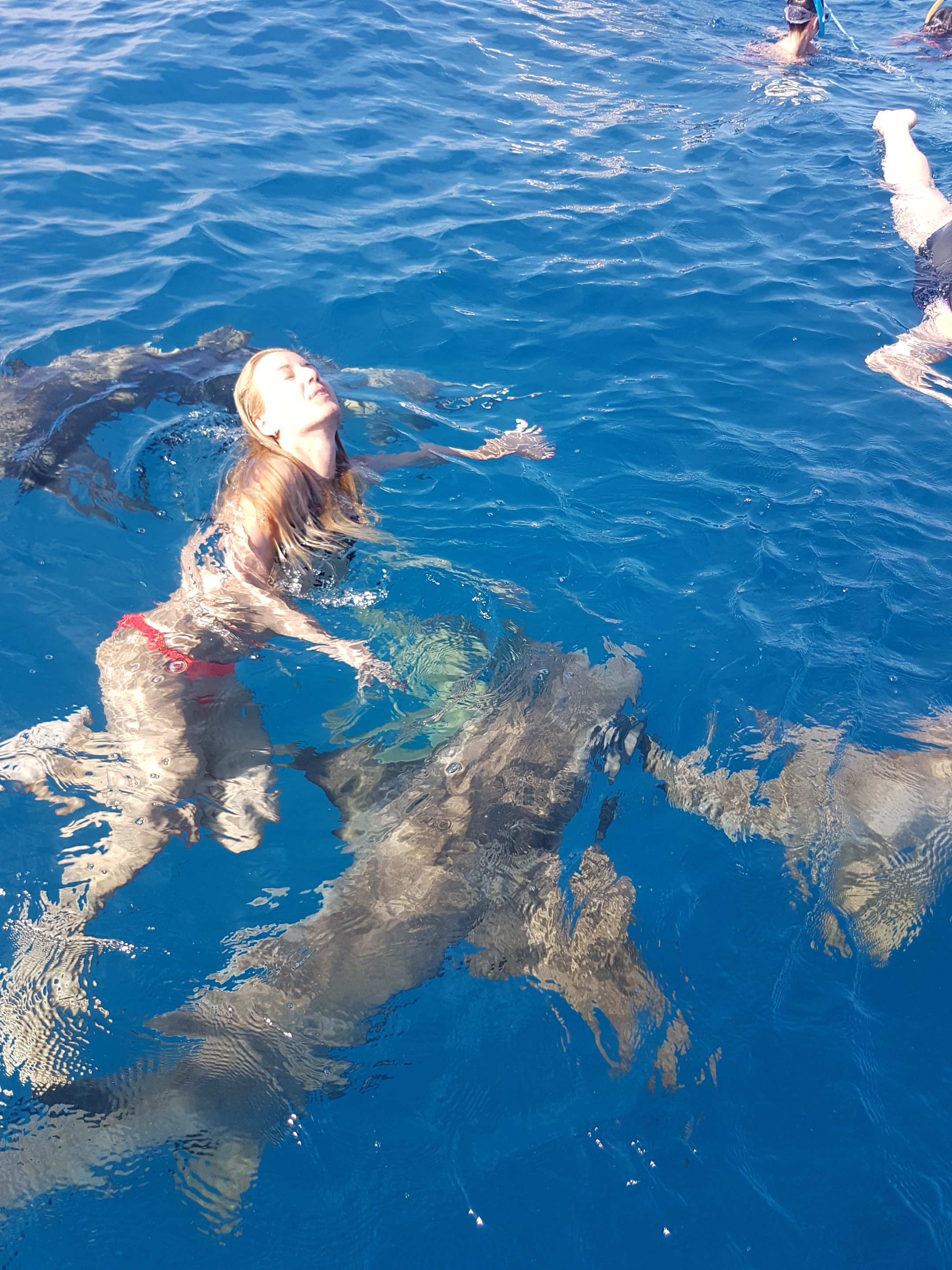 Eu am avut noroc că unul dintre instructori m-a luat de mână și m-a dus în locul unde era rechinul. Când vezi acestă vietate marină realizezi cât de uimitoare este natura, iar senzația trăită nu poate fi explicată în cuvinte. Era un rechin balenă destul de mic, negru cu pete albe, dar înota destul de repede. Eu nu îmi așezasem masca de snorkeling destul de bine, îmi intrase apă și cât am scos capul din ocean să iau o gură de aer, rechinul a și dispărut. Am înotat înapoi la barcă și am plecat în căutarea unui alt rechin balenă. De data aceasta am găsit unul mai mare pe care am putut să-l admirăm mai mult timp.