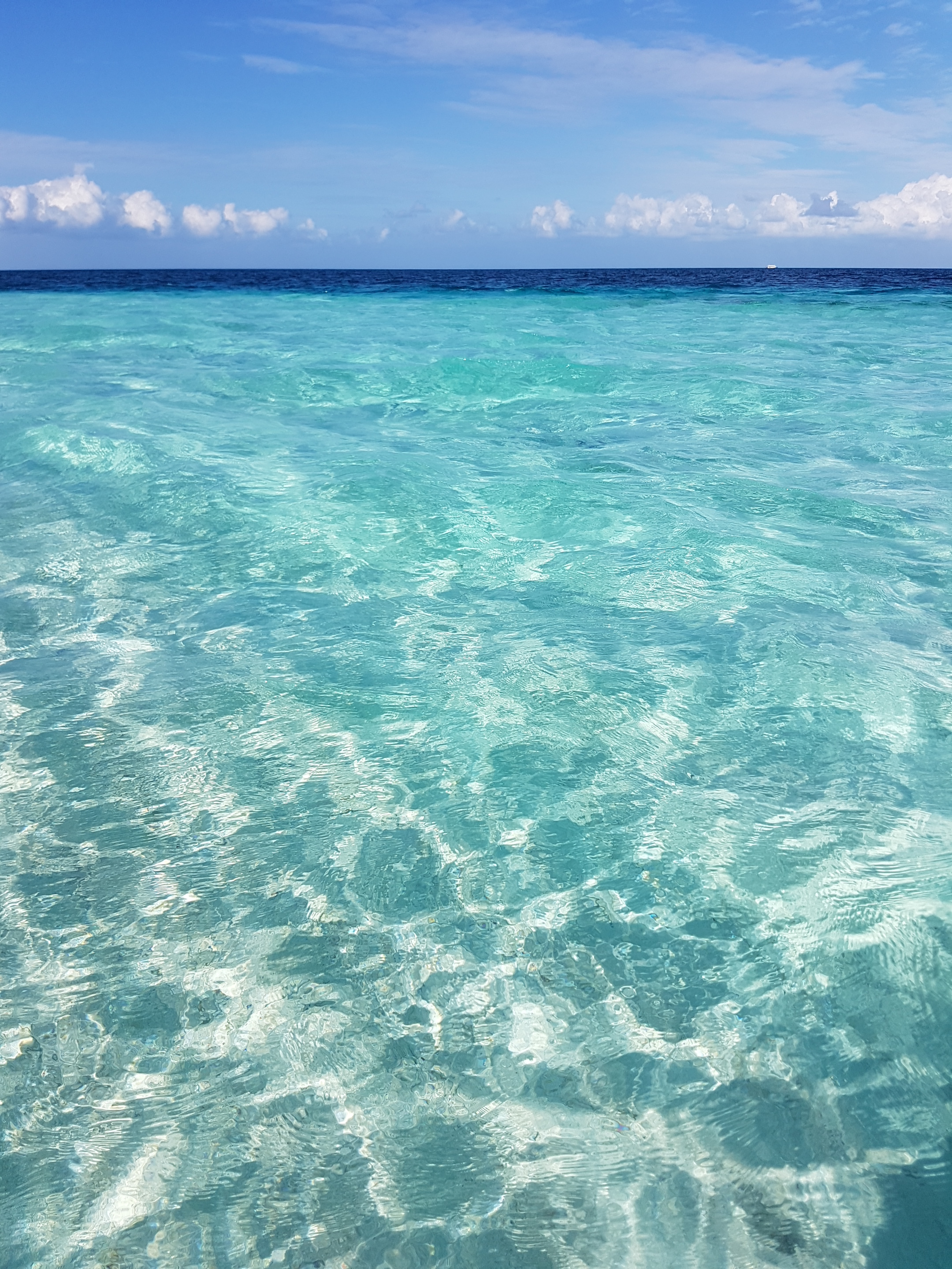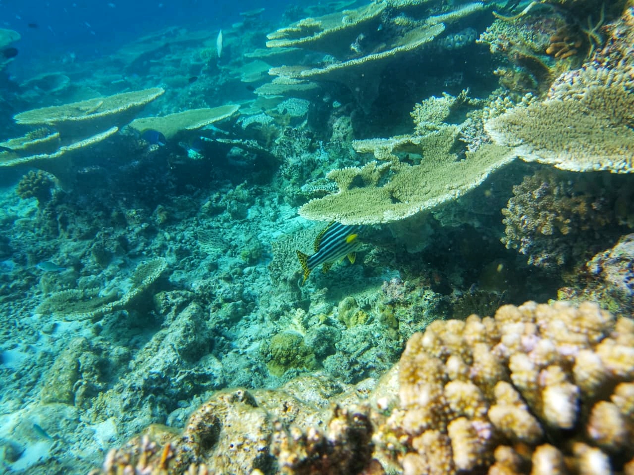 Table corals sunt impresionați și datorită clarității apei aveai impresia că îi atingi cu burta când înotai pe deasupra lor, chiar dacă se aflau la adâncime. Pentru mine snorkeling-ul a fost cea mai tare experiență din Maldive. Nu cred că în altă parte mai poți vedea atât de mulți pești colorați într-un perimetru atât de mic. În plus, poți să vezi foarte mulți pești și de pe mal, cu ochiul liber fară a avea nevoie de mască de snorkeling.