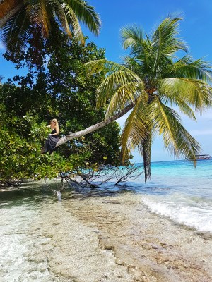 happy girl on a coconut tree in Maldives Fihalhohi Island Resort