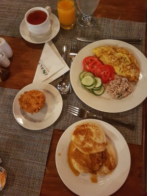 mic dejun sanatos la Fihalhohi Island Resort cu pancakes muffins omleta ceai negru si suc natural de mango