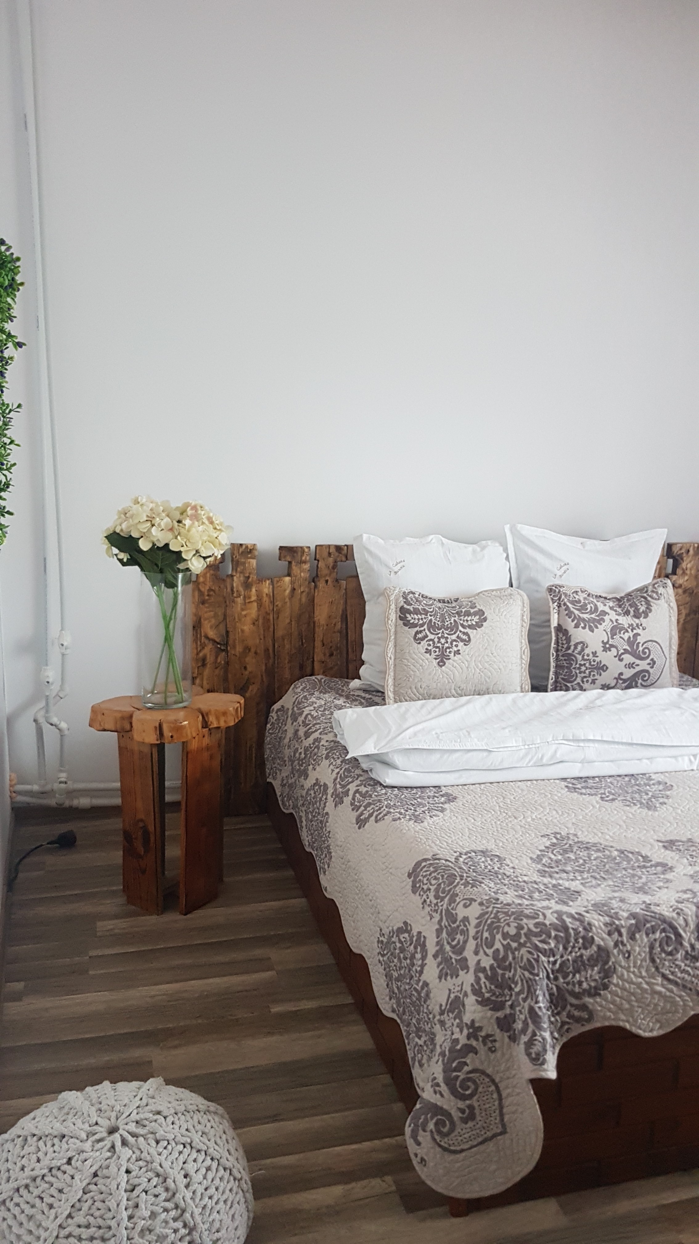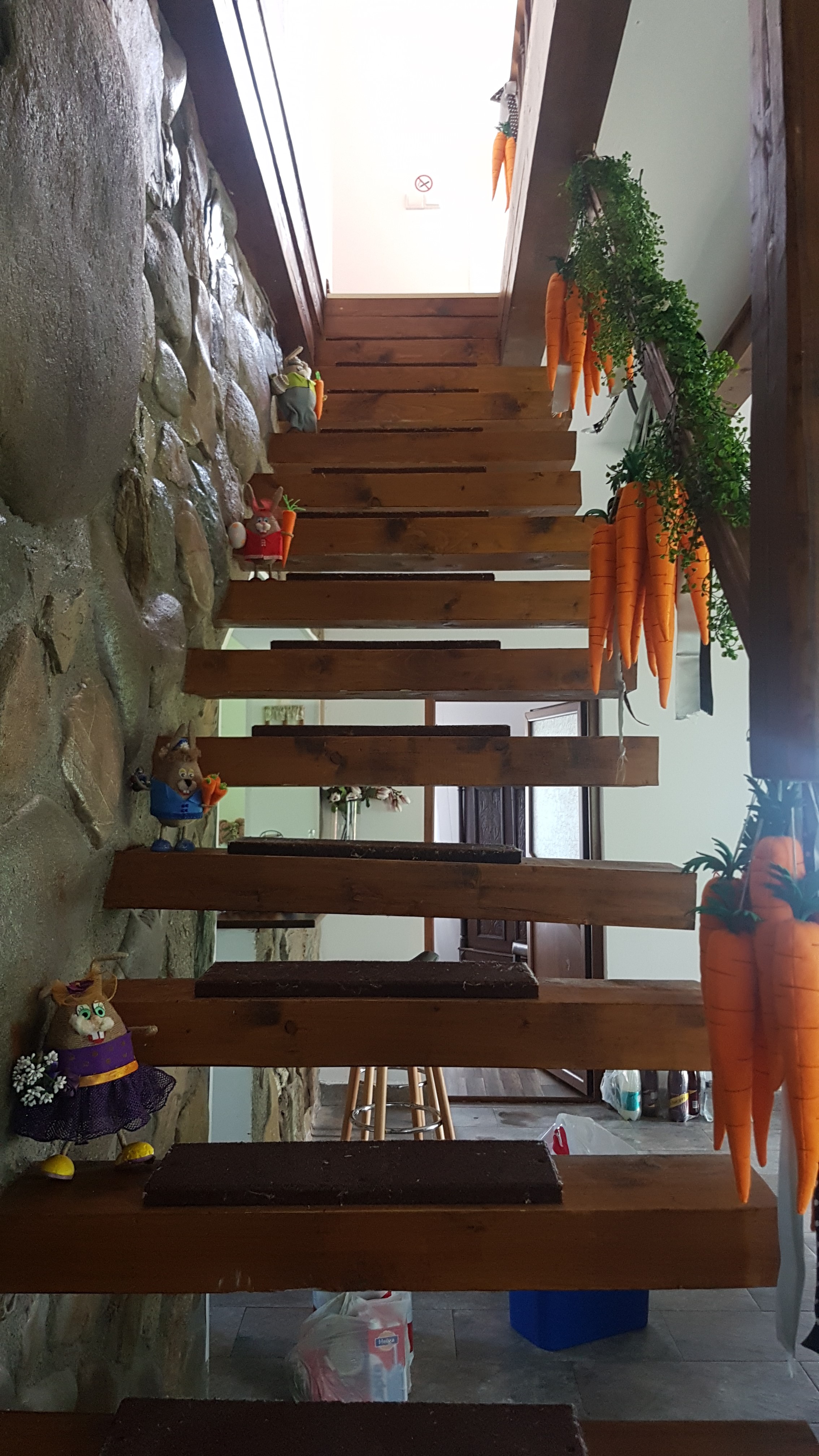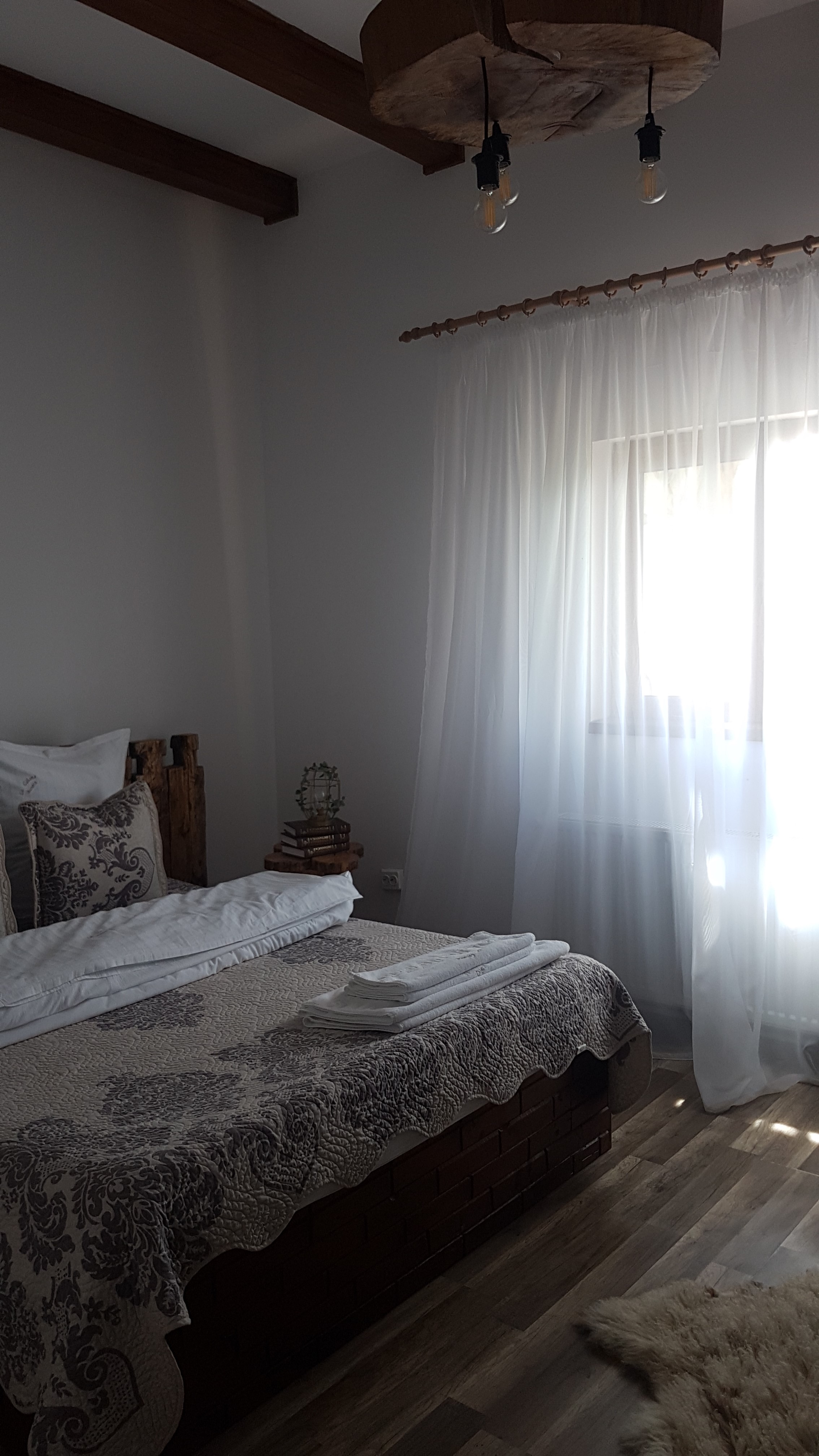 De asemenea și pereții din baie sunt realizați tot din pietre de râu. Tot ce este din lemn: mesele, lustrele, tăbliile de la pat, rafturile de la baie, treptele de la scară, a fost realizat de Răzvan Bunoiu din pură pasiune.