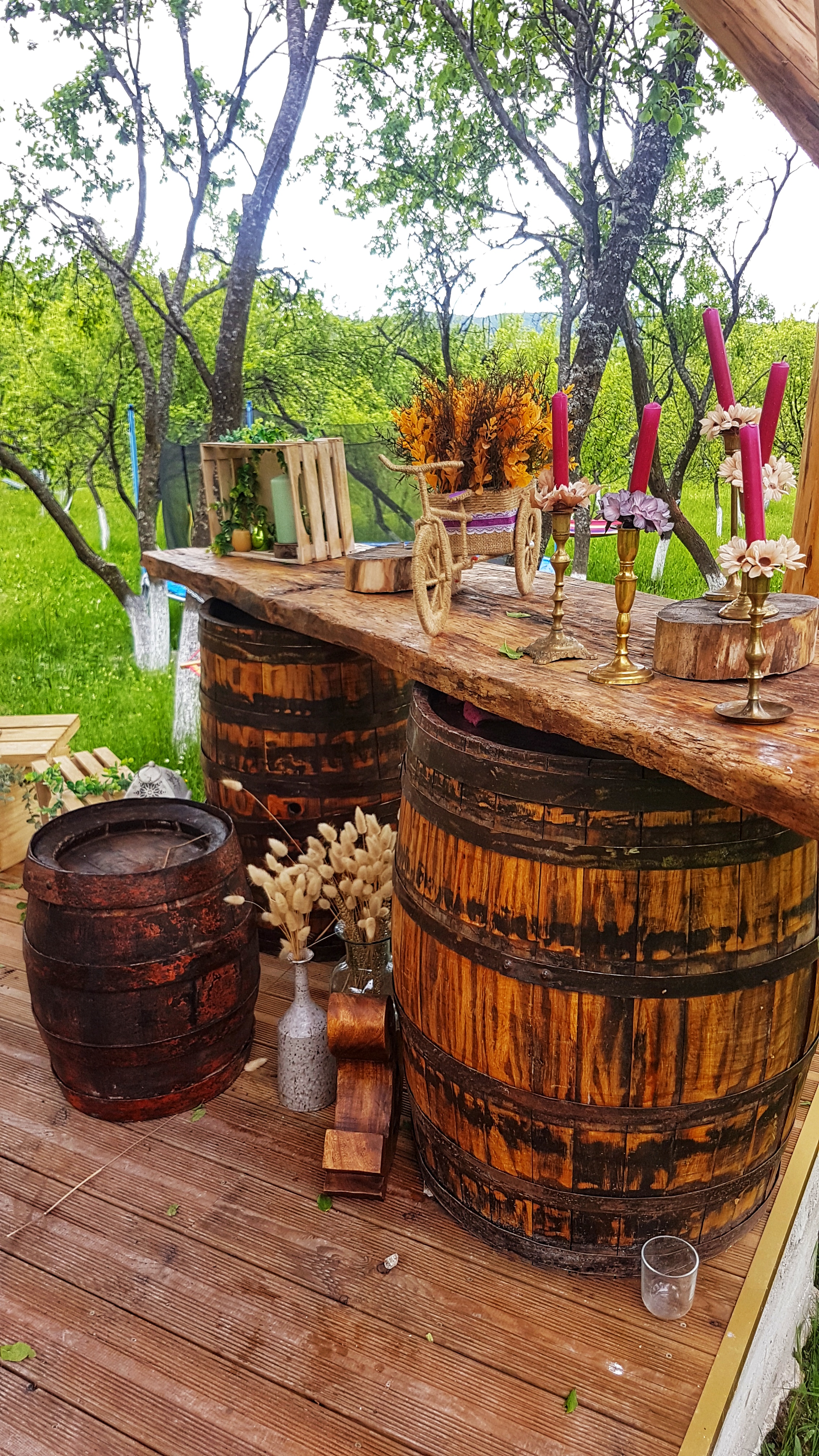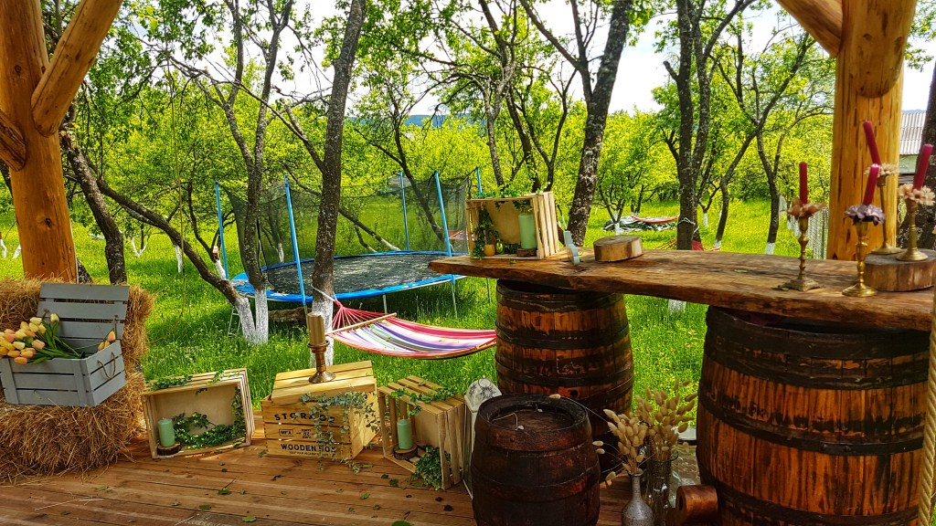 Adevărul este că întreaga locație este foarte instagramabilă, accessorizată cu flori, candelabre, figurine de lemn care îi dau un plus de eleganță și o transformă într-un decor de vis pentru orice eveniment. Foișorul este ideal și pentru a celebra o cununie sau botez cu un număr redus de invitați. Este minunat să servești masa înconjurat de verdeață, mai ales că în față ta se întinde o livadă de câteva hectare.