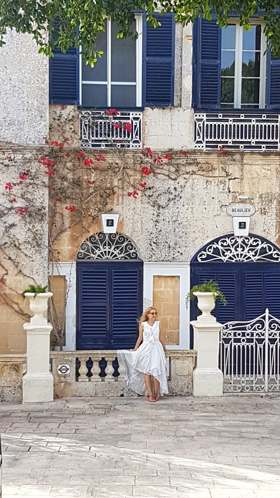 Pe esplanada Sfânta Agatha se află cele mai frumoase case din Mdina. Cea cu storuri albastre și bougainvillea chiar este de vânzare.